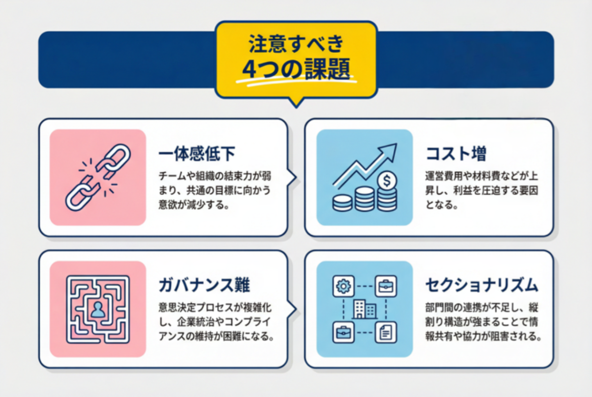 ホールディングス化によって、持株会社は全体の経営方針を決定し、各事業会社は個別に運営される体制となるため、グループ全体としての一体感が損なわれる可能性があります。このような独立した運営のメリットを享受する一方で、会社全体の求心力が低下するリスクもあります。各事業会社の目標が持株会社の方針と乖離している場合、グループとしてのまとまりが弱まり、組織文化の統一が難しくなることがあります。