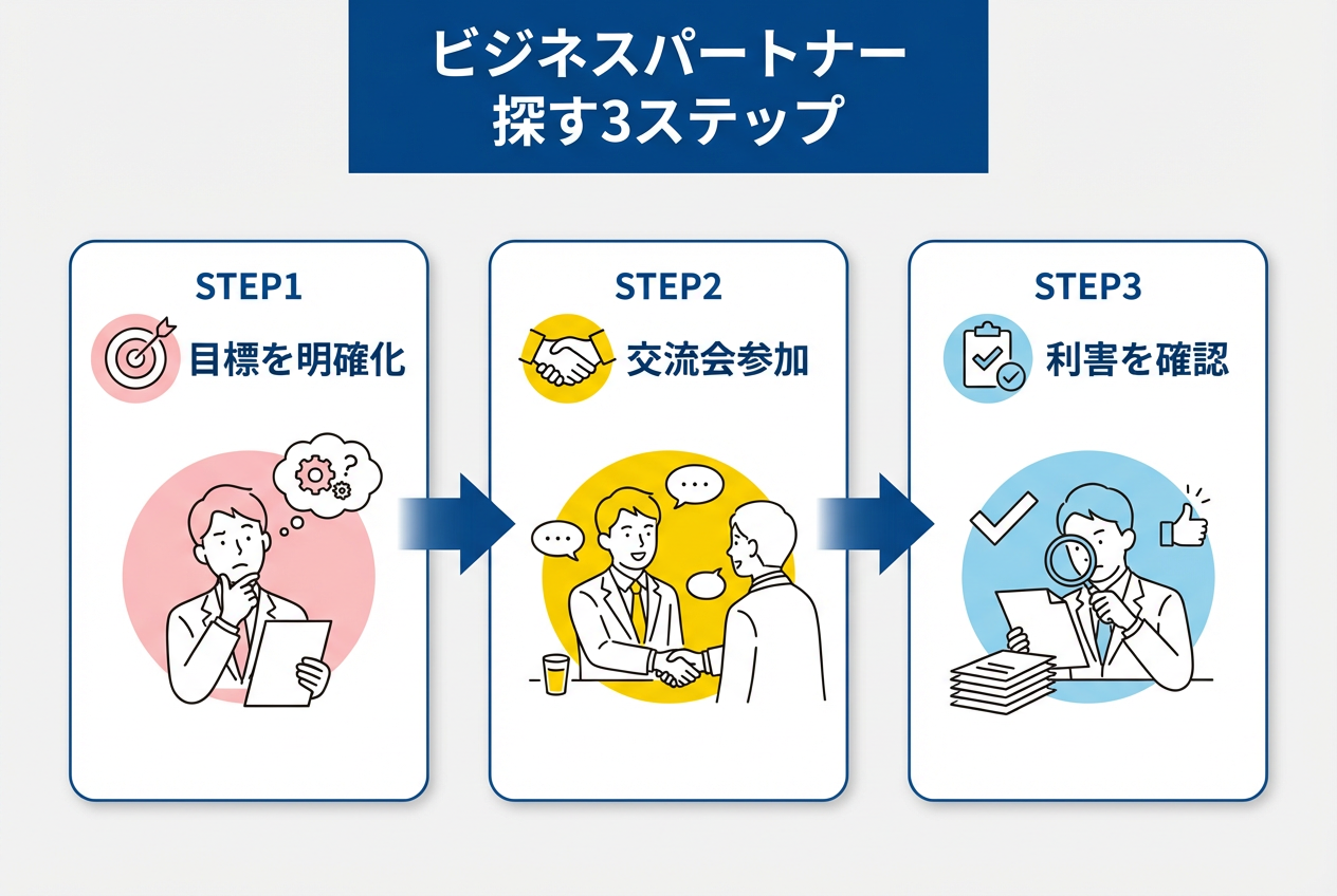 ビジネスパートナーは異業種交流会への参加や同業のイベント、セミナー、講演会などでの出会いで見つかることがあります。