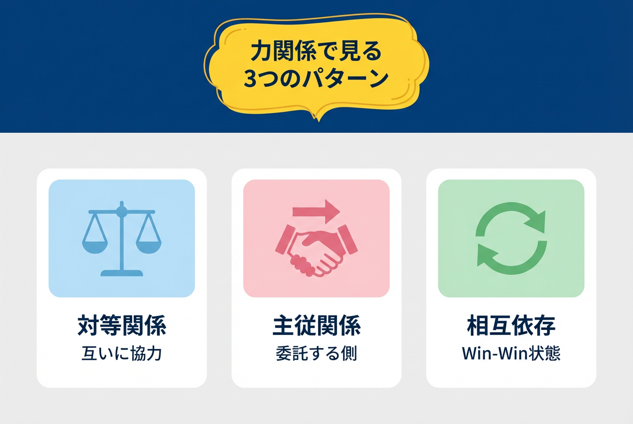 力関係としては対等なことが多いものの、主従関係がはっきりしているケースもあります。ビジネスパートナーになってほしいとお願いし、そのお願いを受け入れるケースだと主従関係になりやすいでしょう。