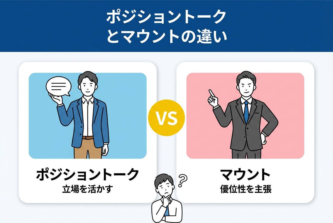 ポジショントークもマウントも同じような使われ方をされていますが、その目的は微妙に異なります。自らの立場を主張するものの、その結果、相手に自分の優位性を認めさせるのか、単に主張しているだけなのかという点が違うポイントと言えるでしょう。