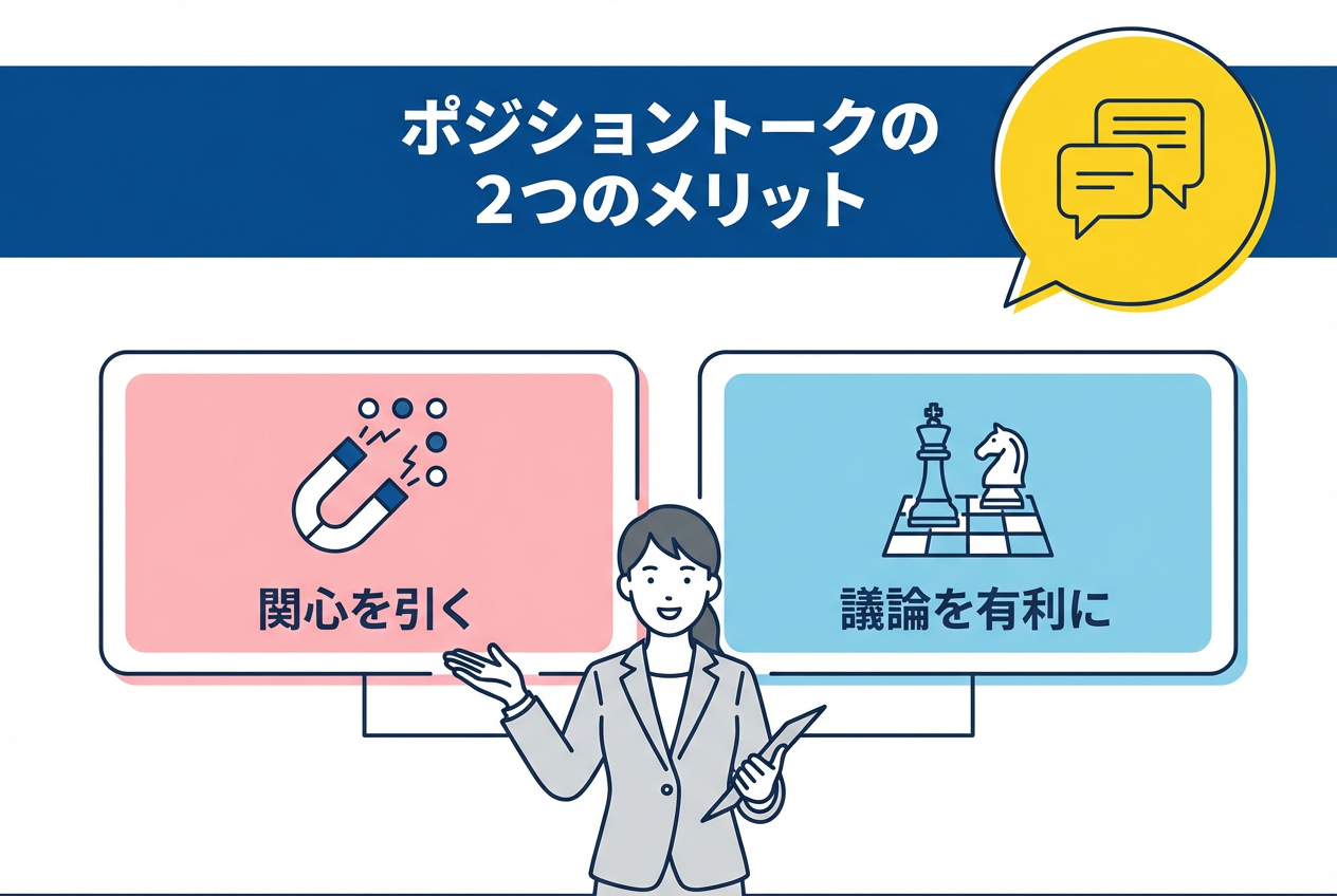 議論を有利に導くことができ、結果として思惑通りの状況を作り出せるのもポジショントークのメリットです。その分、露骨な誘導をしないようにすることが求められます。