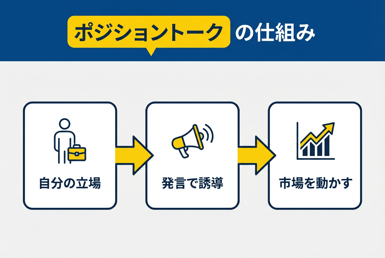 例えば、自らが抱える資産の価値を高めたいと思ったとします。一方で、露骨に資産の価値を高めようとすれば警戒されてしまい、市場が思ったような動きをしなくなるでしょう。ポジショントークは予測として発言し、巧みに誘導する時に用いられます。