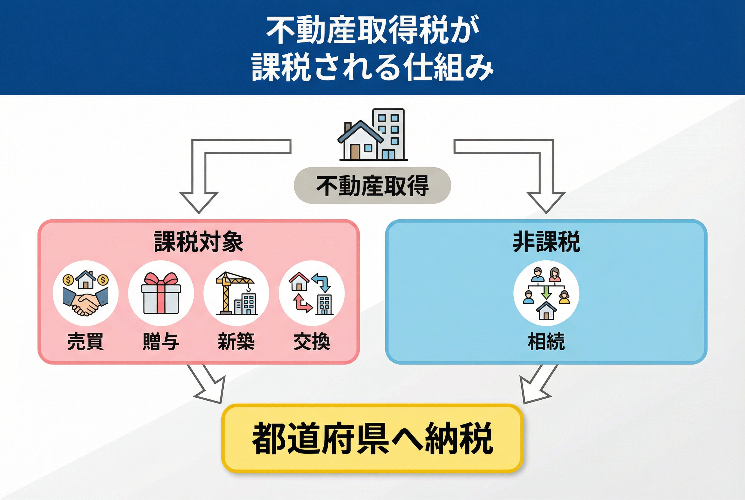 取得:売買や交換だけでなく、新築・増改築・贈与・相続など、幅広い形態が含まれます。ただし、相続による取得は法律上、課税対象外とされている場合が多いです。