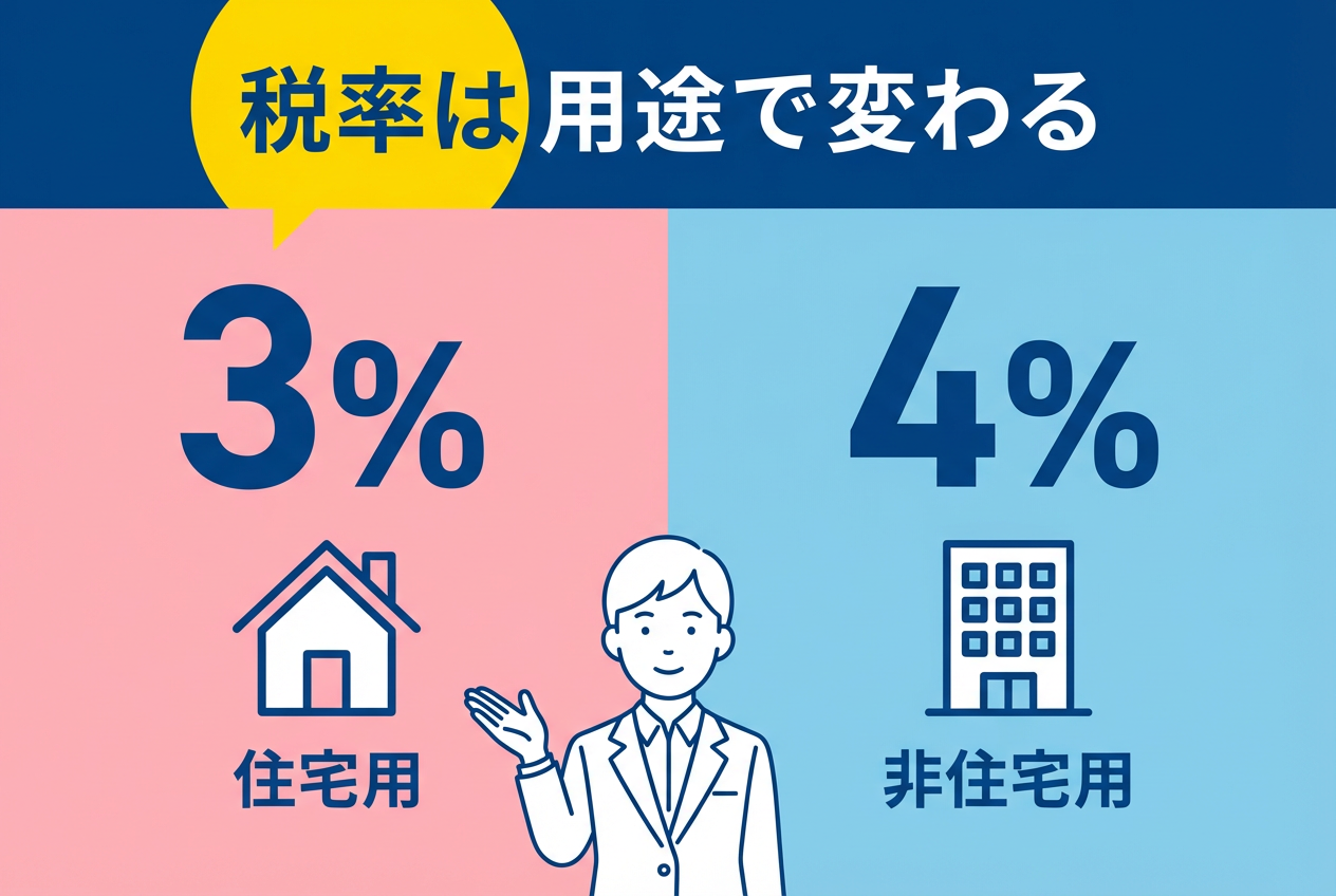 不動産の用途によって適用される税率は異なります。住宅用の土地や住宅用の建物には特例措置が適用されることが多く、税率は3% となるケースが一般的です。一方で、店舗・オフィス・投資用物件などの住宅以外の物件には、標準的に4%の税率 が適用されます。