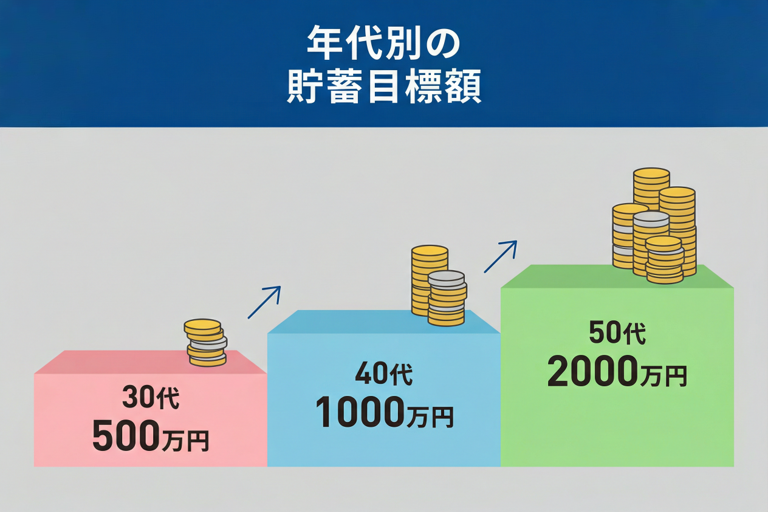 目安としては、30代でまず500万円、40代で1,000万円、50代で2,000万円を目指すと安心です。特に「老後2000万円問題」では、高齢無職夫婦の生活費が30年間で約2,000万円不足するとされており、これを埋める備えが必要です。50代以降は支出が減りやすく貯蓄のチャンスも増えるため、退職までに2,000万円以上の資産形成を目標にしておくと安心です。