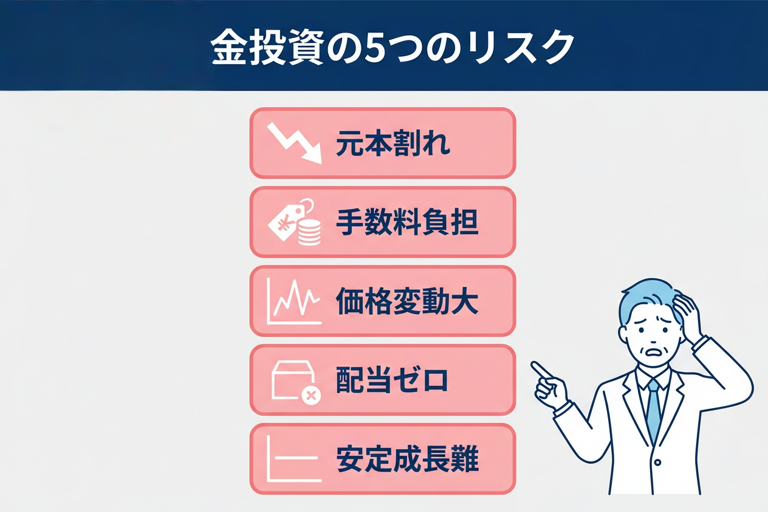 金は値上がり益を狙う資産であり、保有していても現金収入は得られません。株式の配当金や債券の利息を再投資して資産を増やす「複利効果」を活かしたい人にとっては、物足りなく感じる可能性があります。