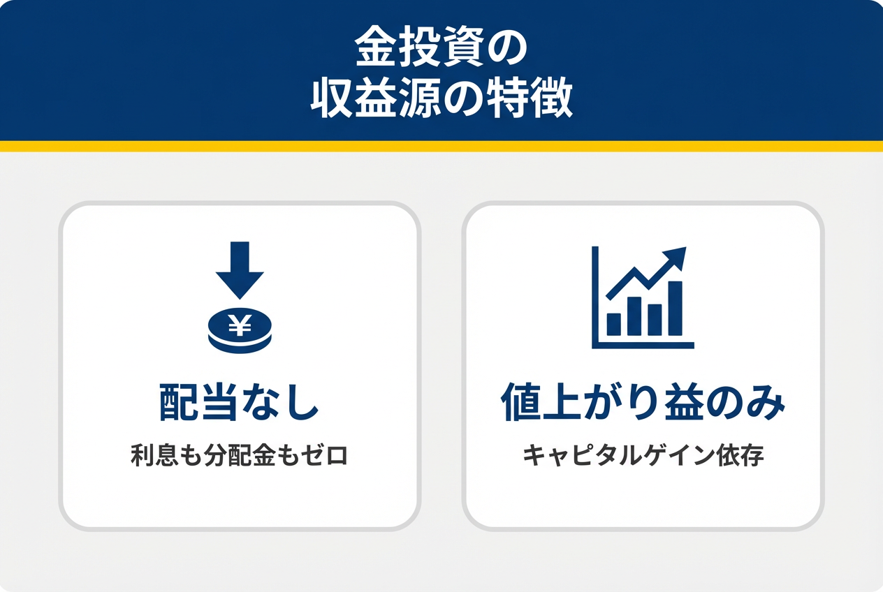 値上がり益のみの運用なので、金価格が大きく上昇しなければ利益はほとんど得られません。実際、価格が停滞すれば儲けはゼロ、下落すれば損失になります。