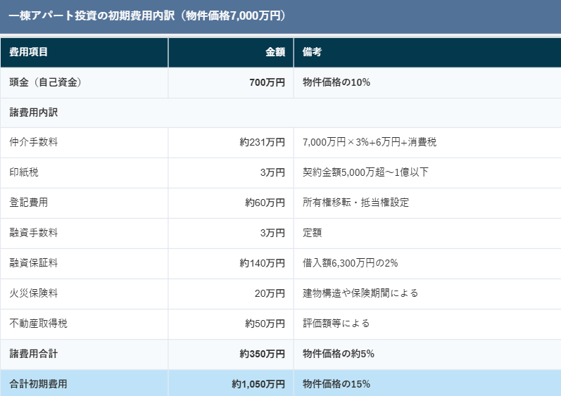 仮に自己資金を2割(1,400万円)入れれば借入は5,600万円に減り、保証料も一括払いで約110万円と抑えられます。一棟アパート投資ではこのように初期費用が数百万円〜1,000万円超とまとまった額になる点に留意が必要です。複数戸からの家賃収入が得られるメリットと引き換えに、スタート時の資金ハードルは区分より高めと言えるでしょう。