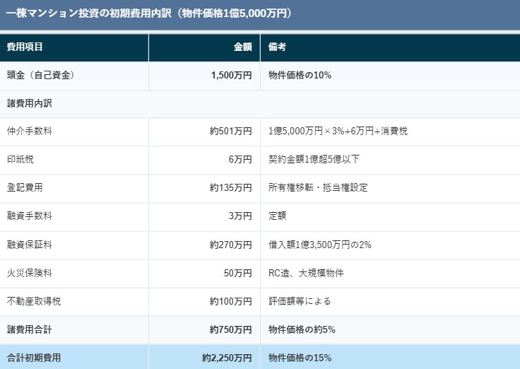 一棟マンション投資では初期費用が数千万円規模となり、自己資金を厚めに用意しなければなりません。もちろん融資条件によっては頭金をさらに増やす必要もあり得ます。