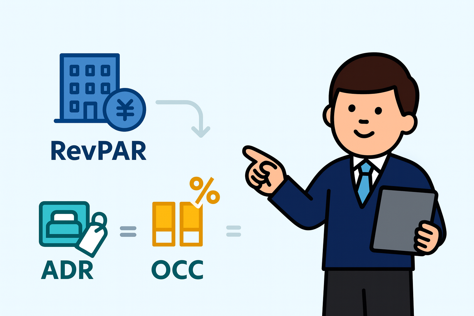 RevPARは稼働率(OCC)と平均単価(ADR)を掛け合わせた総合指標で、ホテル全体の稼ぐ力を示します。