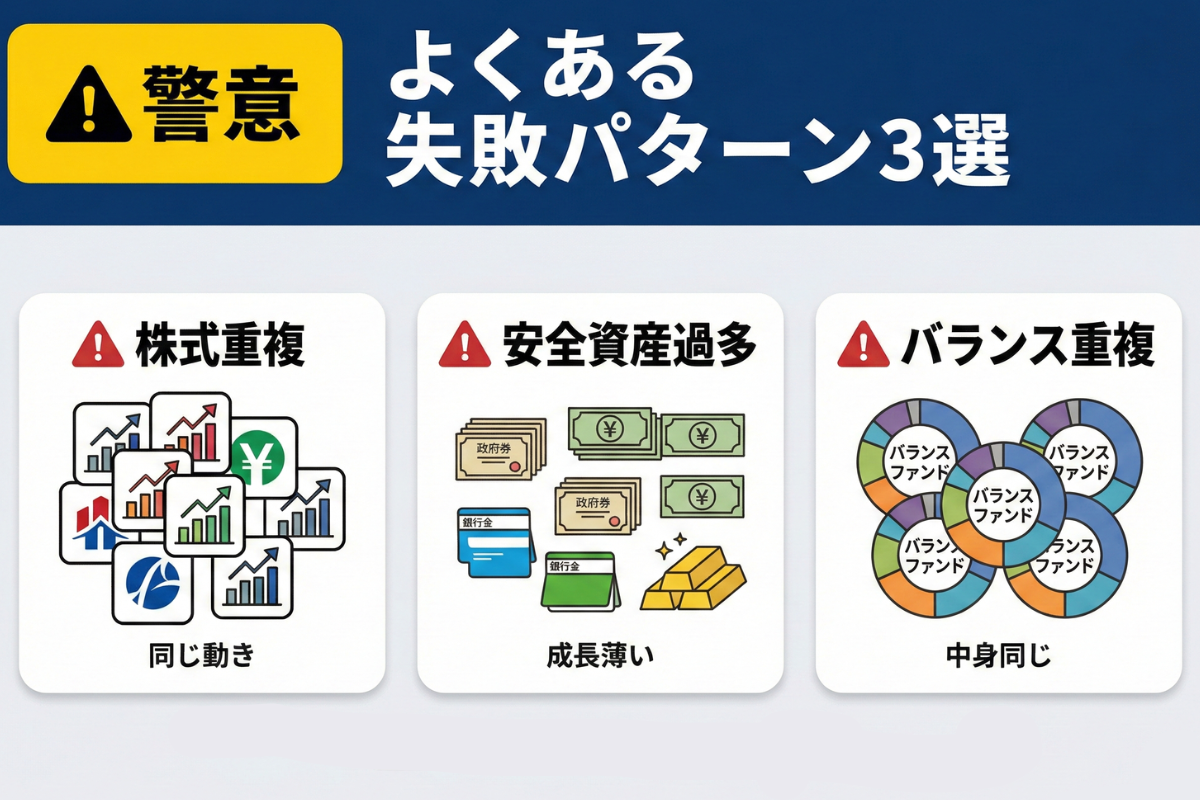 元本確保型の商品や債券系ファンドなど、安全資産ばかりを複数組み合わせる例も“分散しすぎ”として見られます。
