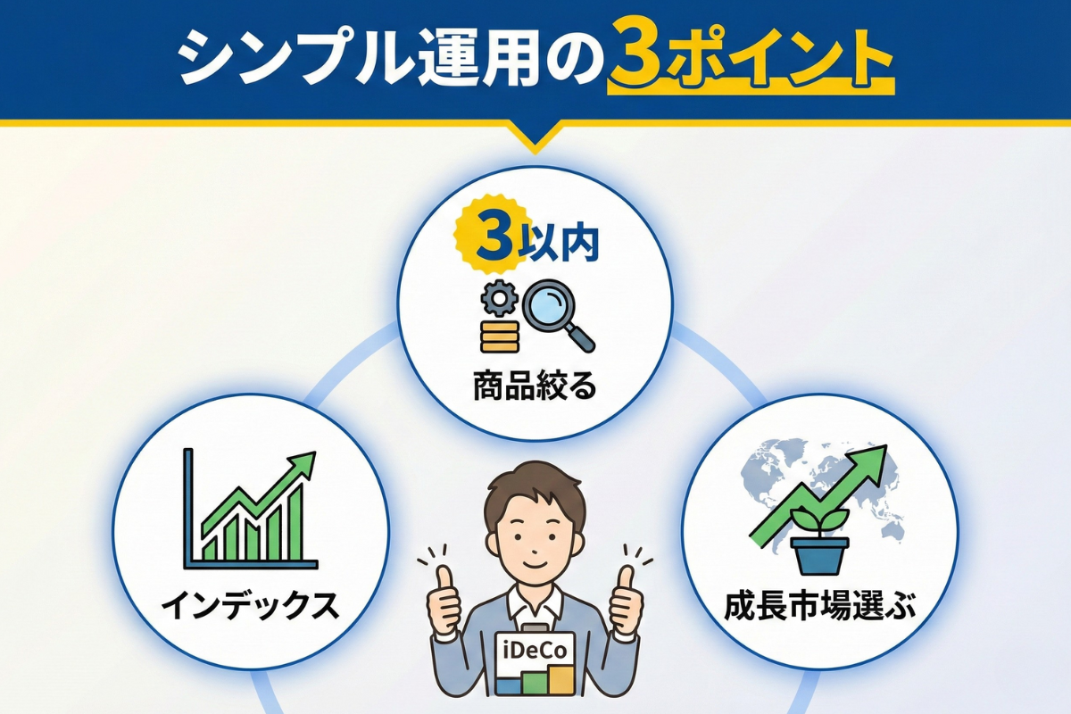 運用商品は、中身がシンプルなインデックスファンド(指数連動型)を中心に選ぶだけで長期の成果が安定しやすくなります。