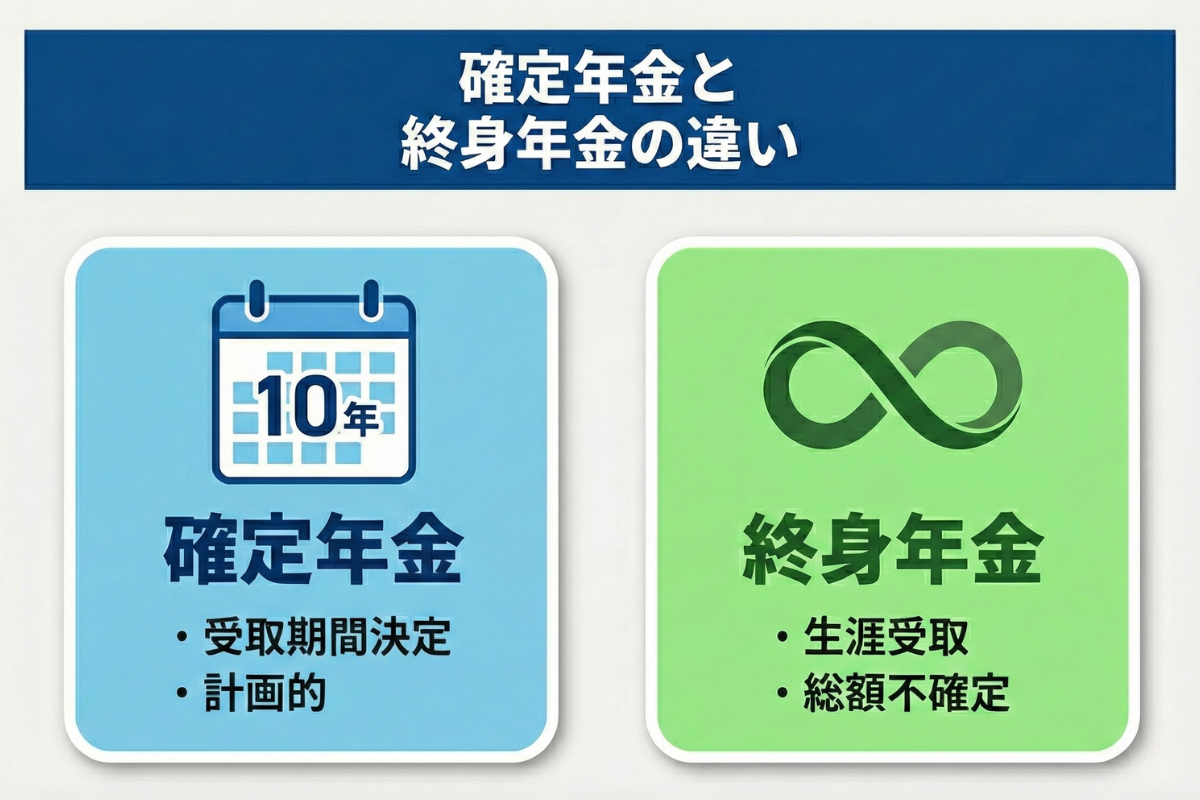 個人年金保険の年金受取タイプには、一定期間受け取れる確定年金と、生涯受け取れる終身年金(有期年金含む)があります。60代で老後資金計画を立てる際には、それぞれの特徴を理解して選ぶことが大切です。