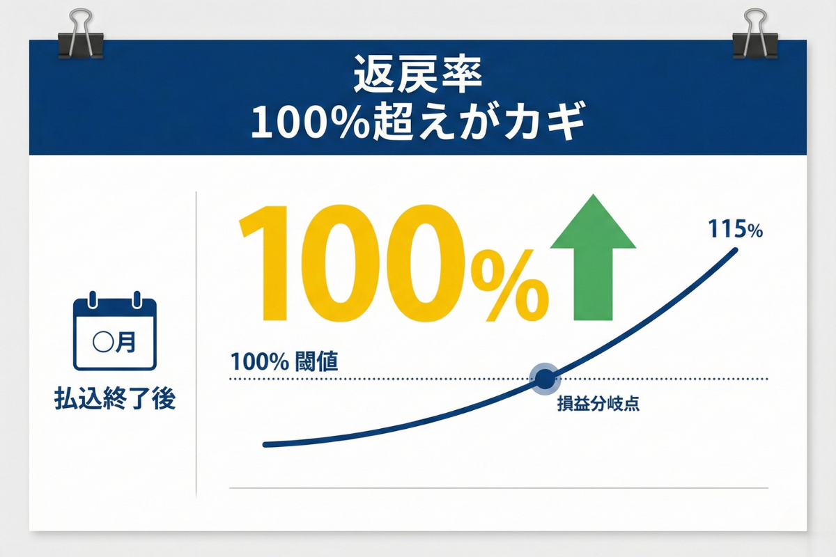 返戻率が100%ということは、解約返戻金が払込保険料総額と同額、100%を超えれば解約返戻金が払込額を上回ることを意味します。解約による損得を判断する上で非常に重要な数値です。