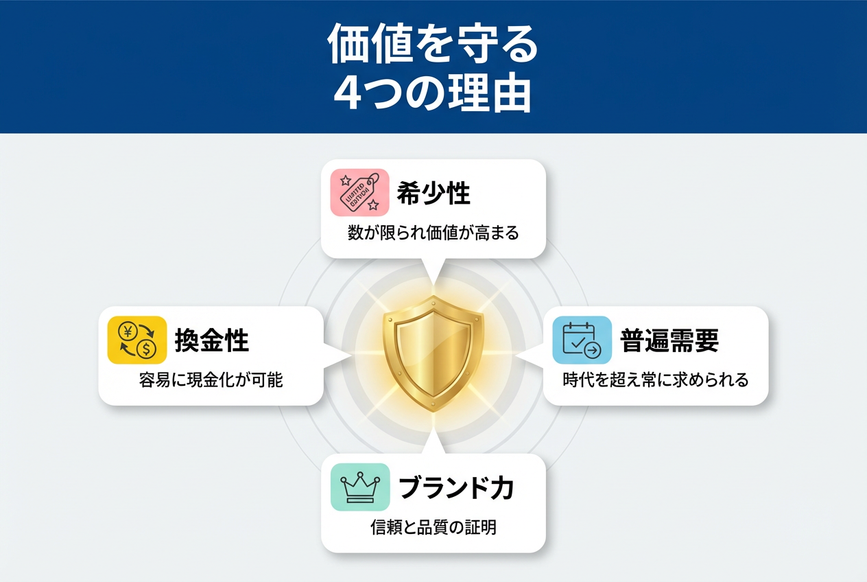 3つ目の理由は、ブランド力や歴史的背景による価値の底上げです。長い歴史や確固たるブランドイメージを持つ物は、それ自体が信頼の証となり価値減少を防ぎます。