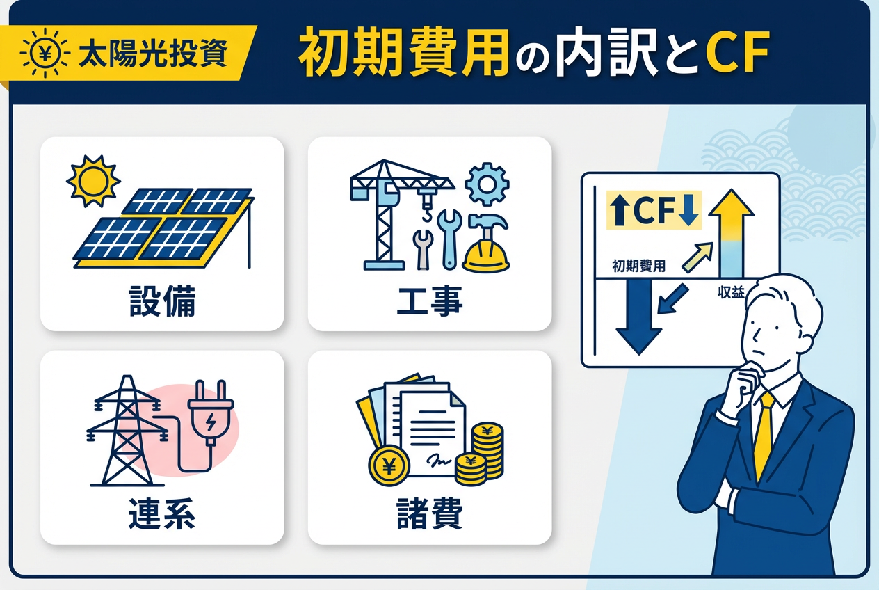 太陽光発電投資の初期費用は、大きく「設備代+工事費+系統連系費+諸費用」で構成されます。