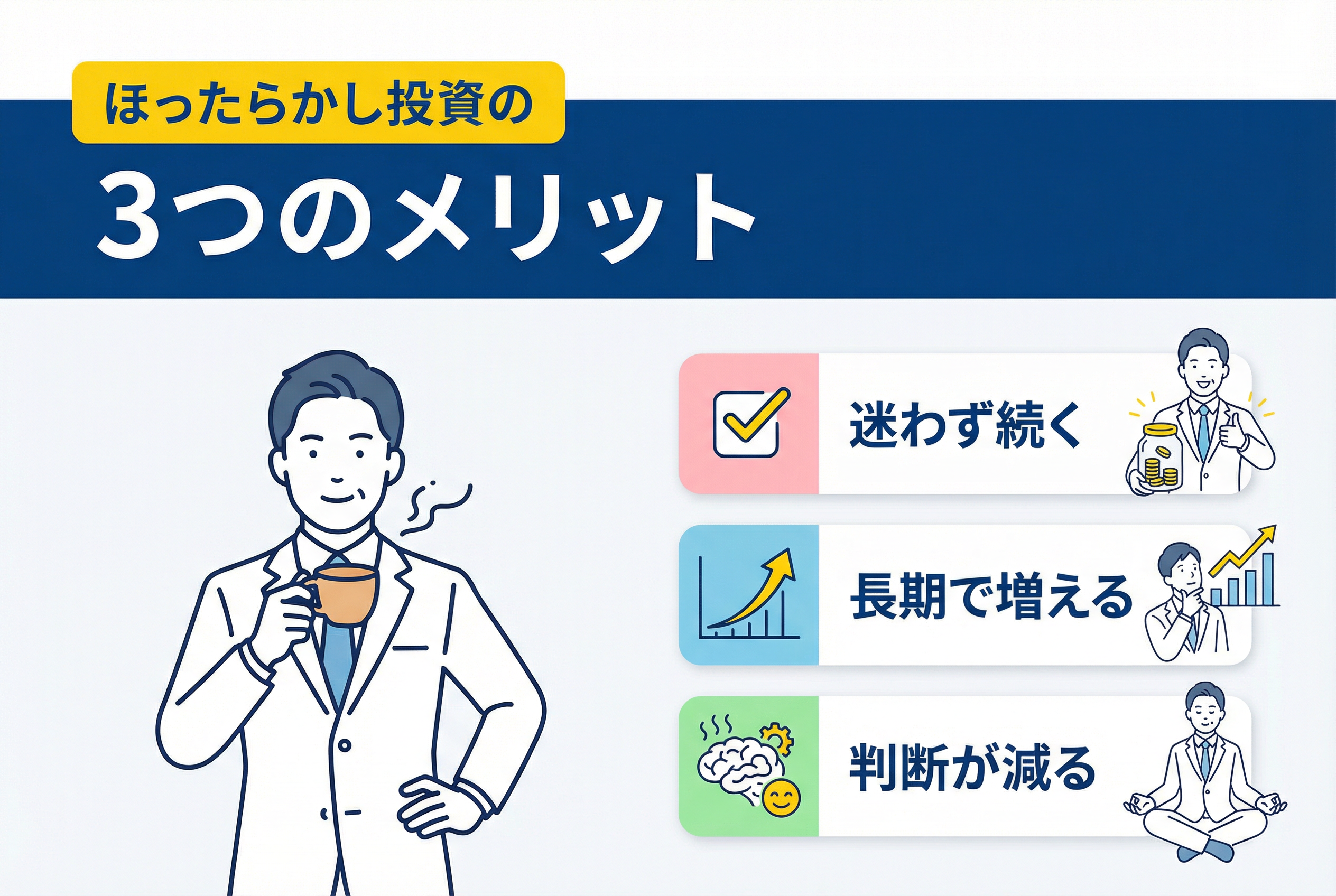 人は判断のたびに感情が入りやすいものですが、決断する回数を減らせばブレも減ります。意思決定に悩む場面がない分、相場の上下に振り回されずに済み、長期的に投資を続けやすくなります。