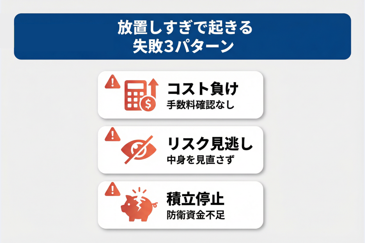 実際には、放置しすぎて相場変動やコストの変化に気づかず損をしたり、逆に怖くなって途中で積み立てをやめてしまったりと、失敗する人も少なくありません。