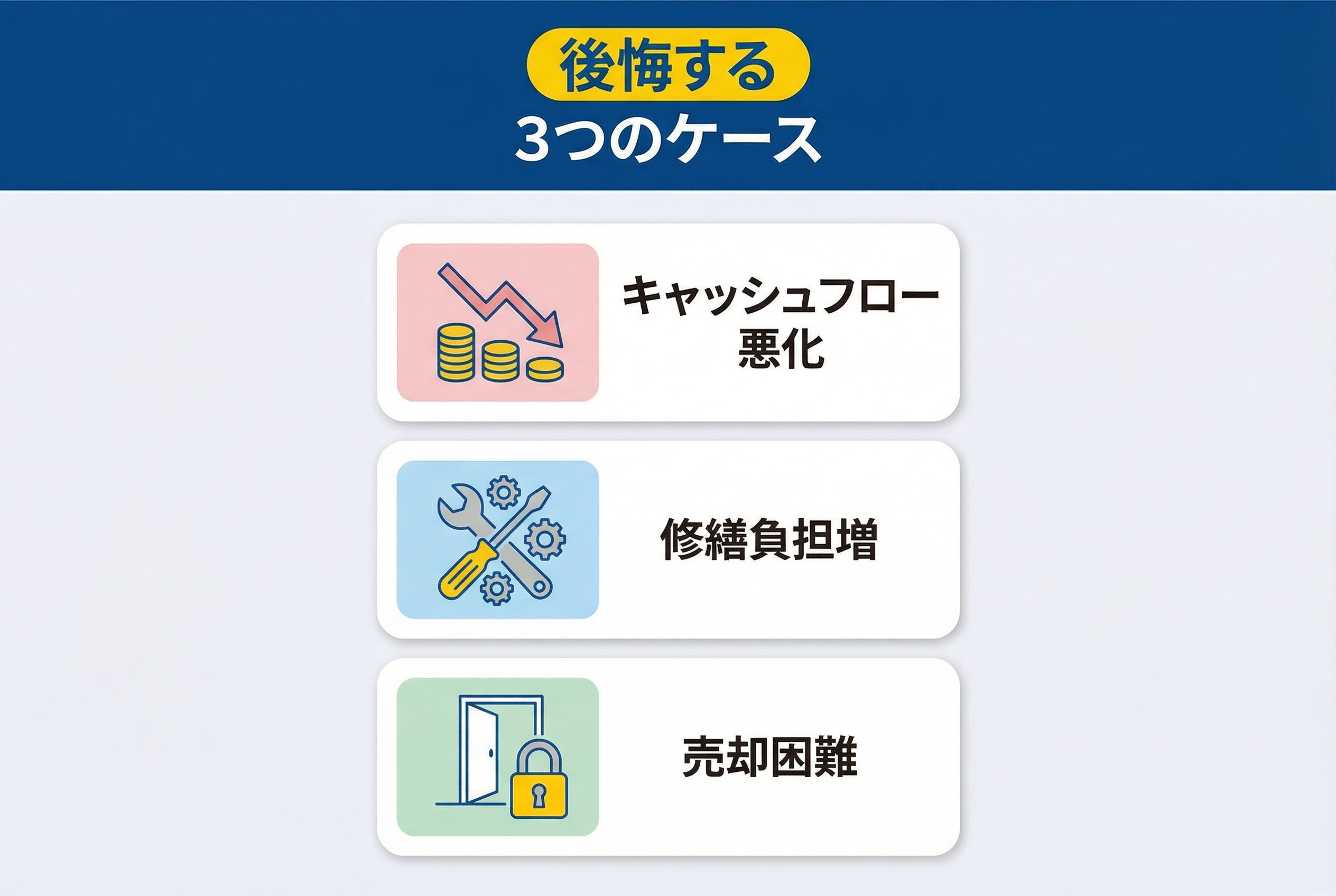 具体的には「家賃が1〜2割下がる」「数か月の空室が出る」「想定外の修繕が重なる」を同時に置きます。