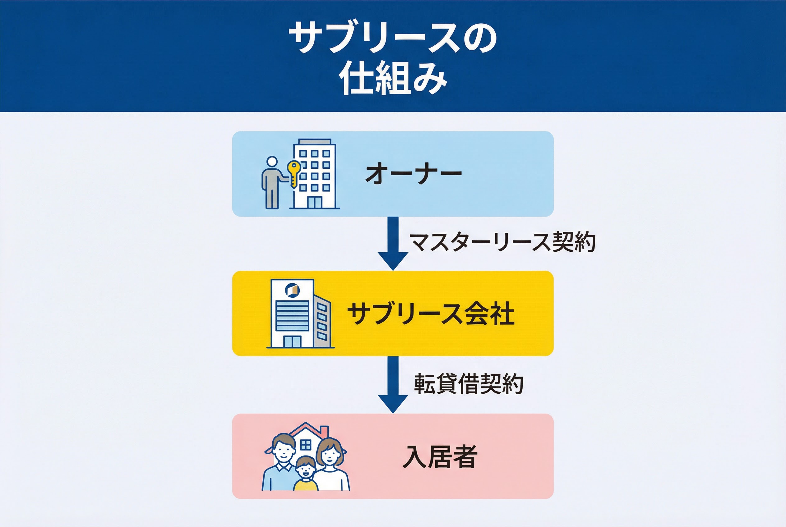 サブリースとは、オーナーが会社に一括で貸し、会社が入居者へ転貸して運用する形です。